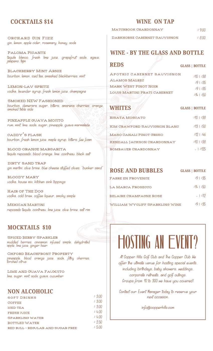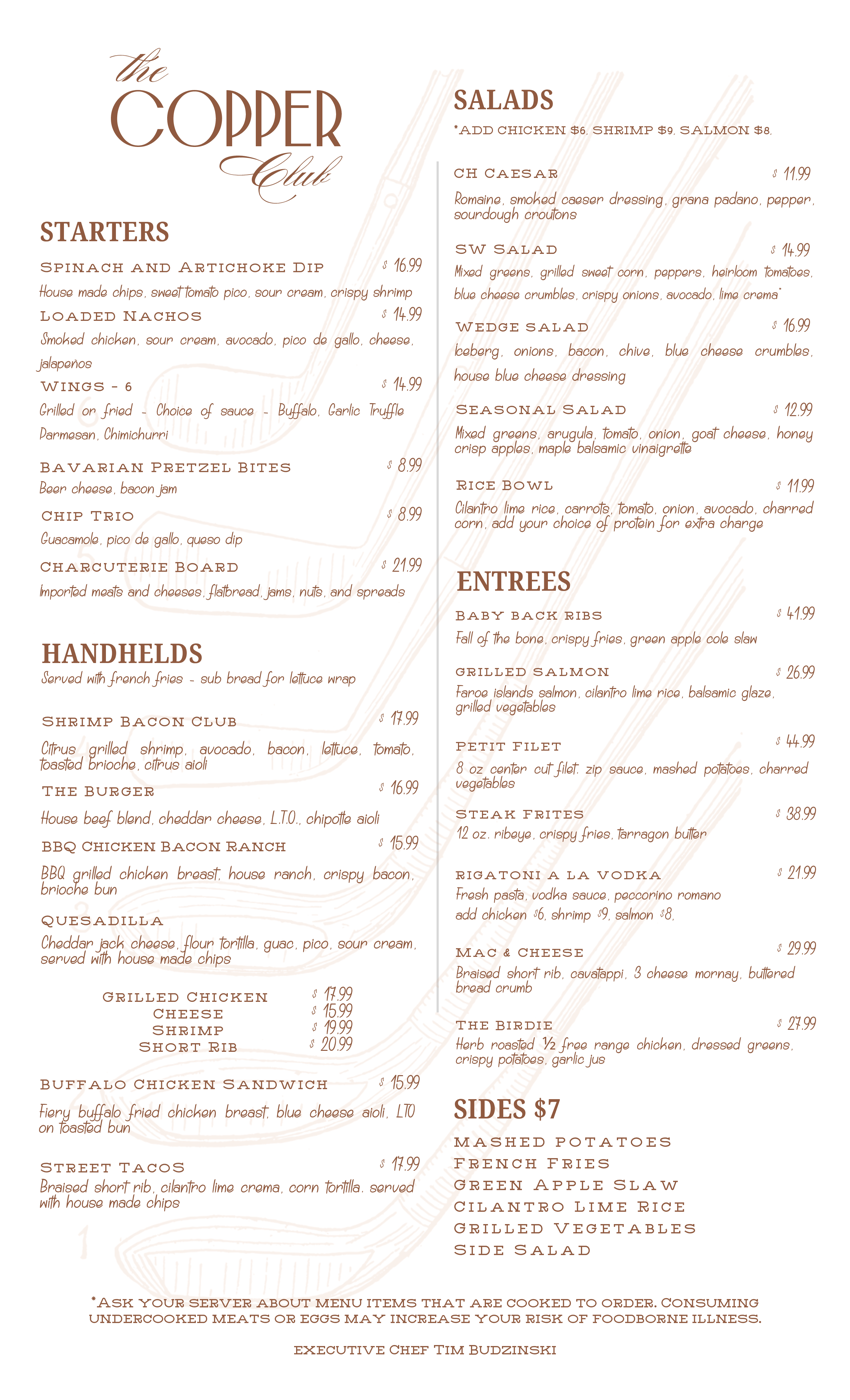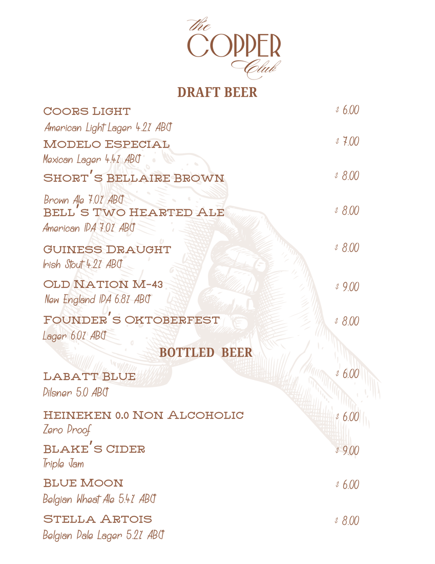 From craft cocktails to seasonal draft beers, the Copper Club bar has amazing choices. See our detailed restaurant menus and cozy up to the bar to watch the latest sports and games.